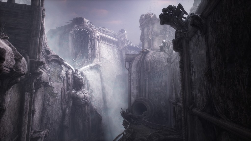 In the world of Scorn, this mind/body problem is reflected in the Crater and the Polis; the dungeon-factory forms the murky guts that feed the feverish dreams of the philosopher-kings enthroned above. These mutants have emerged from Plato’s fleshy cave into the luminous world of the Forms. The telling detail is found in the environmental design. Every structure of the Assembly is purely functional, a massive skeleton which cannot spare an inch on indulgence. In contrast, the Polis boasts friezes and statuary: pregnant figures, copulating couples, a carven creature that suspiciously resembles the Parasite itself. The decadent grandeur of the corpse-city titillates my nostalgia for the speculative wanderings of J.G. Ballard and H.P. Lovecraft.
